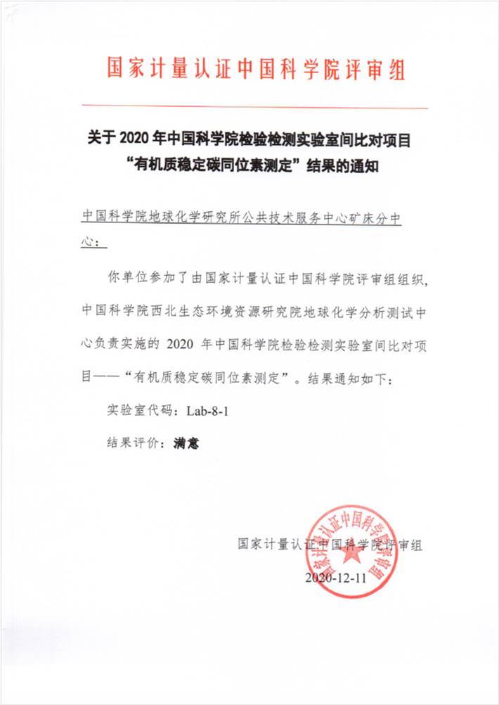 近日收到“国家计量认证中国科学院评审组”的正式通知,地球化学所参加2020年度实验室间比对计划的结果为“满意”。