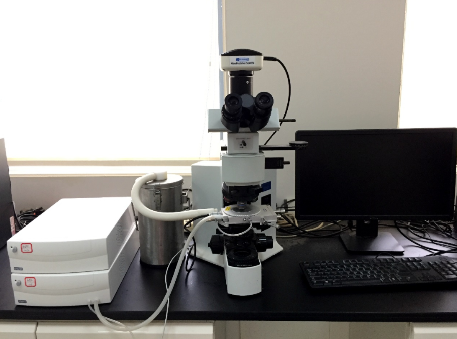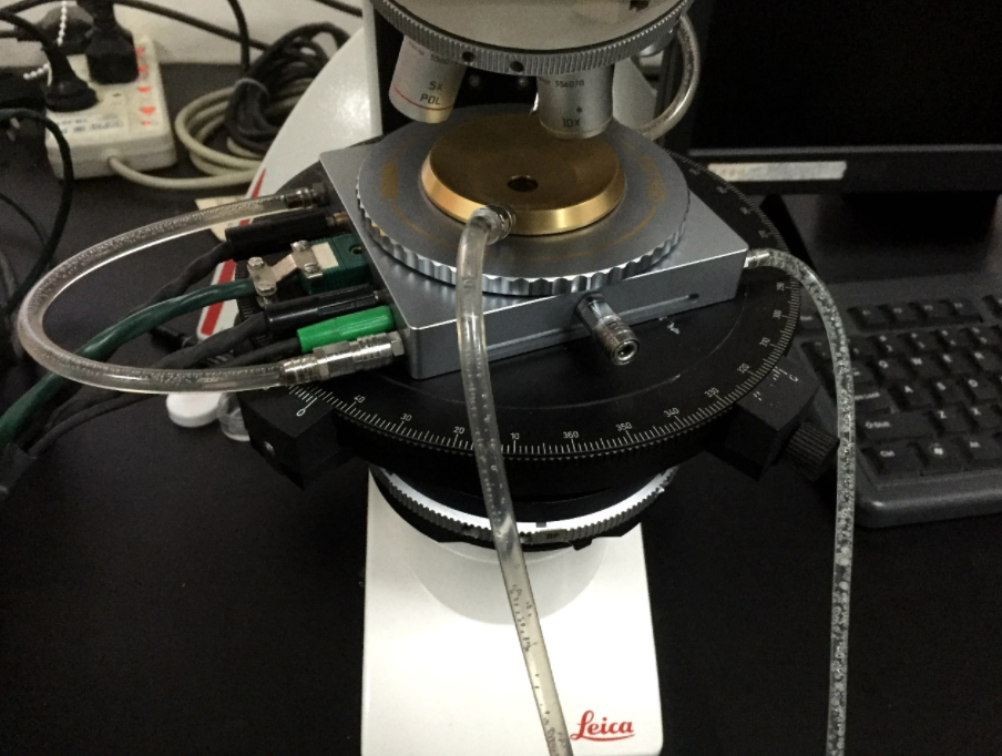 4、Linkam THMSG600型冷热台。具有高导热的银质加热台、高精度测温铂电阻和特殊的光孔设计,确保包裹体在测温中精准观测。LNP液氮冷却系统的冷却速度由0.01℃/min至150℃/min,自动控制速率。液氮在温度控制器的控制下由冷却泵自动注入银质加热台。