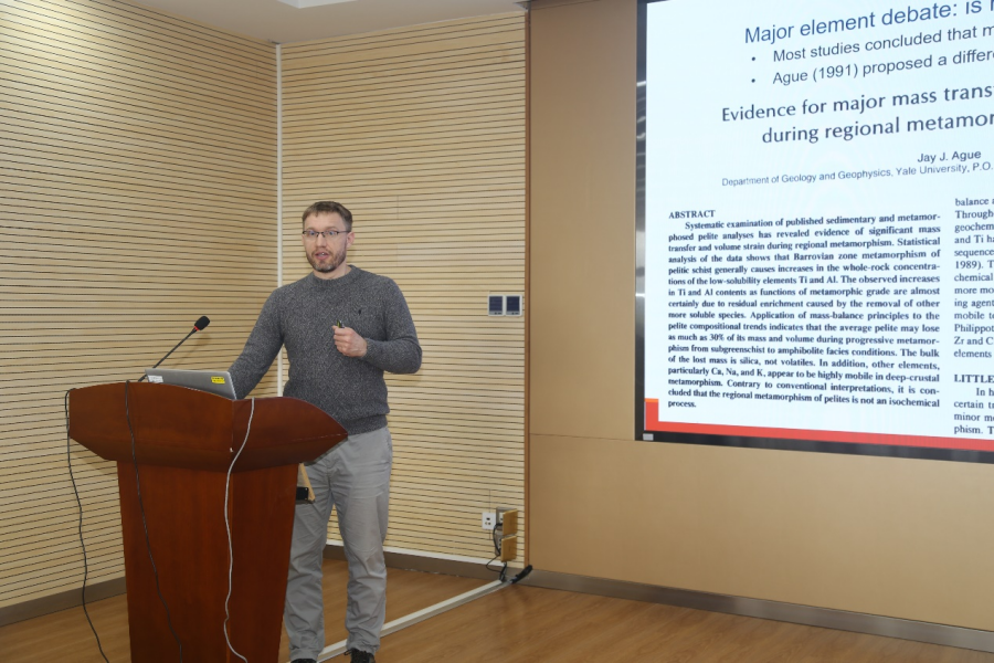 Stepanov Aleksandr教授首先介绍了变沉积岩在变质作用过程中微量元素的迁移富集趋势。Hg和Cd等在低温变质作用过程中就会大量丢失,而高场强元素如Zr、Hf、Nb、Ta、REE等基本保持不变。Au、Sb、Ag和W等元素与As在绿片岩相变质时发生迁移,这与造山型金矿的形成紧密相关。通过该研究,深化了变质作用过程与热液矿床的形成之间联系的认识。随后,Aleksandr教授又介绍了部分熔融残留的暗色体(restite)的地球化学特征。研究表明,暗色体较原岩SiO2, Na2O, K2O丢失,与花岗质熔体的成分相对应。对于微量元素而言,它们的富集、亏损受独居石等富REE、Th、U的矿物溶解控制。不相容元素Li受堇青石稳定性控制,但在熔体中仅富集2-5倍,最多10倍。因此,Aleksandr教授指出花岗质熔体结晶分异,而不是直接部分熔融,是形成稀有金属花岗岩的机制。