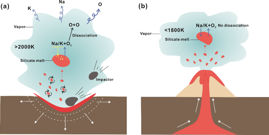 图5 月球超高速撞击(>2000 K)与火山喷发(<1800 K)环境中碱金属挥发分行为的差异示意图