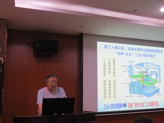王浩院士主要介绍了自然水循环和社会水循环,即“二元水循环”的研究史、理论及关键科学问题,并结合淮河流域研究示例进行了深入浅出的讲解,王院士认为社会水循环会加速水循环演变过程,人类活动对水循环的影响形式主要是温室气体排放、改变下垫面以及人工大规模取用耗排水等,该研究的三个关键科学问题分别是多过程耦合互馈机制、演化机制与水资源演变规律以及水量-质-效转化机理。