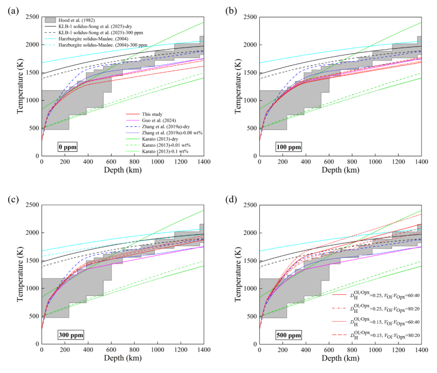 图1:对月球热结构的指示意义:利用本研究测定的顽火辉石热物理性质模拟得到的月球内部温度-深度剖面。图a至图d分别对应地幔整体水含量为0、100、300和500 ppm的情况。在每个子图中,本研究的模拟均包含了不同氢分配系数(