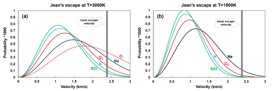 本研究揭示的碱金属行为与月球火山玻璃(如阿波罗74220号样品)形成了鲜明对比。火山玻璃珠形成于较低温度(<1800 K),在此条件下:氧气分子(O2)稳定存在,不会大量解离(图3);钠、钾、氧的逃逸速率相近,蒸汽保持氧化环境(图4b);碱金属以氧化物形式直接冷凝,不伴随FeO还原和金属铁生成。这一对比清晰地表明,温度是决定碱金属在月表行为的关键(图5)。